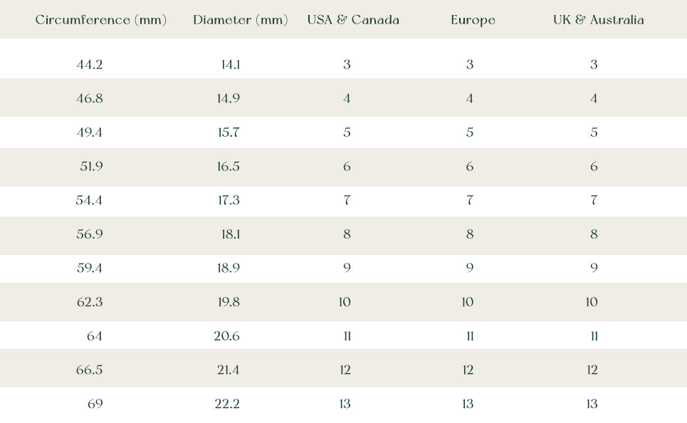 4. Measure the length of the string/paper on a ruler and compare to the measurement below. That is your ring size.